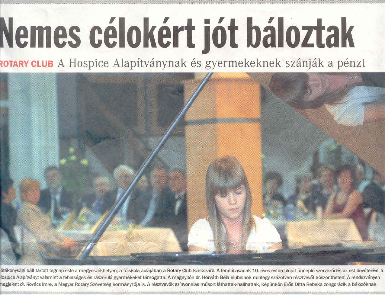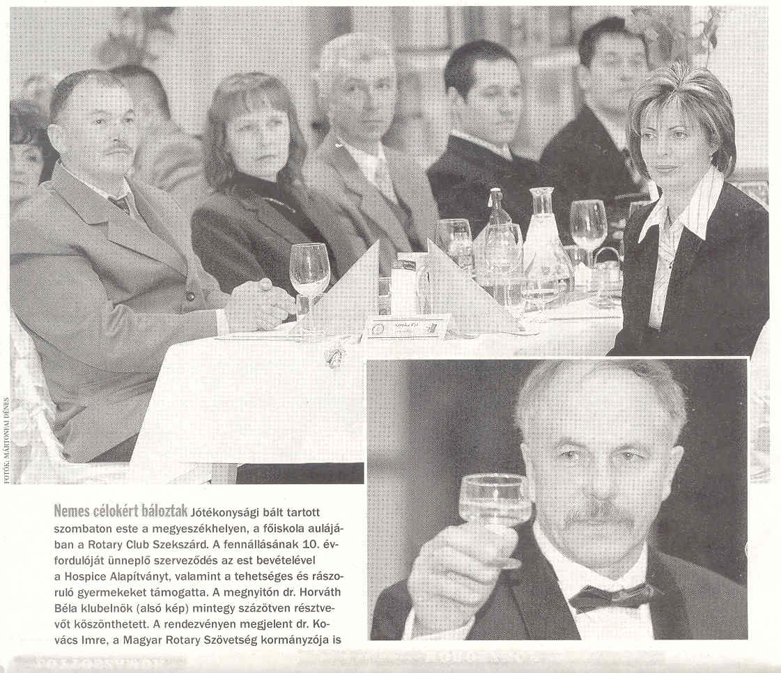 Jubileumi jótékonysági Rotary Bál 2008. január 12-e jelentős dátumként íródott be a tízéves klubunk történetébe. A jubileumi év első nagy eseményét, a hagyományos jótékonysági bálunkat, erre a napra szerveztük. Az előkészületek visszanyúlnak a 2007-es esztendő augusztus utolsó klubüléséhez, amikor is elnökünk ismertette éves programját, és akkor többek között jelezte azon elkötelezettségét, hogy a hagyományos bálunk megrendezését fontosnak tartja. Ettől kezdve szinte minden ülésünkön kisebb-nagyobb mértékben téma volt a bál. A rendezvény célja is hamar megfogalmazódott bennünk, mely szerint a bevétellel a tehetséges, rászoruló szekszárdi tanulókat és a Hospice Alapítvány helyi szervezetének munkáját terveztük segíteni. Kialakult egy szervezői csapat a klubtagokból, akik megérdemlik nevük említését: Dr. Horváth Béla elnökünk és Dr. Hankovszky Zsolt alelnökünk a kulturális programok megszervezését, Módos Ernő titkárunk az étel-ital, terem, zenekar megszervezését, Letenyei László és Szabó Zsolt klubtagok a tombola tárgyak gyűjtését és a támogatók megkeresését vállalták. A csoporthoz csatlakozott Szrnka Pál webmester és több lelkes klubtagunk, akik a közönség megszervezésében vállaltak oroszlánrészt. Első nyilvános megnyilatkozásunk a bállal kapcsolatban a Tolnai Népújság január 8-ai számában volt. Ekkorra már 300 névre szóló meghívót átadtunk - a többségét személyesen - ismerőseinknek. Szépen sokasodtak a jelentkezők visszajelzései, a támogatási- és tombolatárgy felajánlások. Maga a bál nagyon jól sikerült, elmondható, hogy 10 éves történetünk legnagyobb látogatottságú, legnagyobb bevételű rendezvénye volt. A sajtó is részletesen tudósított, már másnap a Tolnai Népújság beszámolt a rendezvényünkről, és a TEOL.HU is közzétett képeket. A következő nap ismét téma volt a sajtóban a bálunk, és megtekinthettük Rühl Gizi (klubtársunk feleségének) fotósorozatát is. A rendezvény utáni napokon jó érzéssel fogadtuk a visszajelzéseket vendégeinktől, és az értékelés és mérlegkészítés sem váratott sokáig magára. Eszerint bálunk tiszta hozadéka: 839.920 Ft, ennyivel tudjuk támogatni kiemelt és meghirdetett projektjeinket. Habár a Szekszárdi Vasárnap január 20-ai számában módunk nyílt megköszönni a rendezvényen résztvevőknek és támogatóinknak szíves közreműködését, de ezúton is a klubtagok nevében köszönet – Dr. Kovács Imre Kormányzó úrnak, hogy felvállalta a fővédnöki teendőket - a fellépő művészeknek, akik díjazás nélkül, nívós előadásokkal leptek meg minket - tombolatárgy felajánlóinknak és támogatóinknak anyagi segítségükért - valamint minden résztvevőnek, vendégünknek, kikkel együtt tölthettük ezt a szép estét.