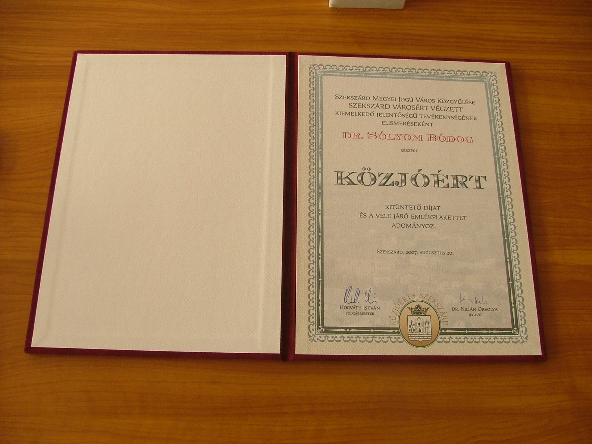 Dr. Sólyom Bódog Szekszárd Közgyűlése a több évtizedes ügyészi, illetve az igazságszolgáltatás terén folytatott munkájáért, továbbá sportvezetői tevékenységéért és a színvonalas szekszárdi kosárlabdasport érdekében való elévülhetetlen érdemeinek elismeréseként Közjóért kitüntető díjat adományozott klubmesterünknek. Gratulálunk! Az eseményről a Szekszárdi Vasárnap 2007. szeptember 2-ai számában írtak.